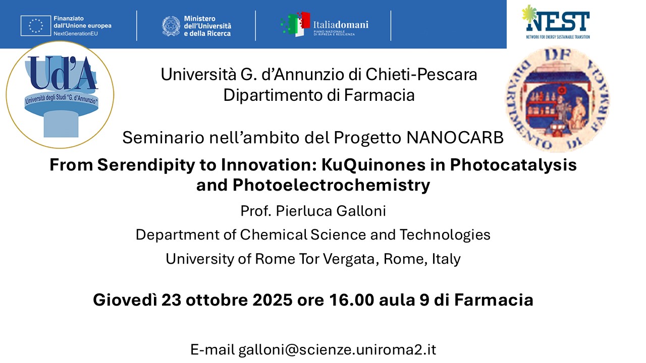 Seminario Prof. Pierluca Galloni (Università Roma Tor Vergata) 23/10/2025 From Serendipity to Innovation: KuQuinones in Photocatalysis and Photoelectrochemistry